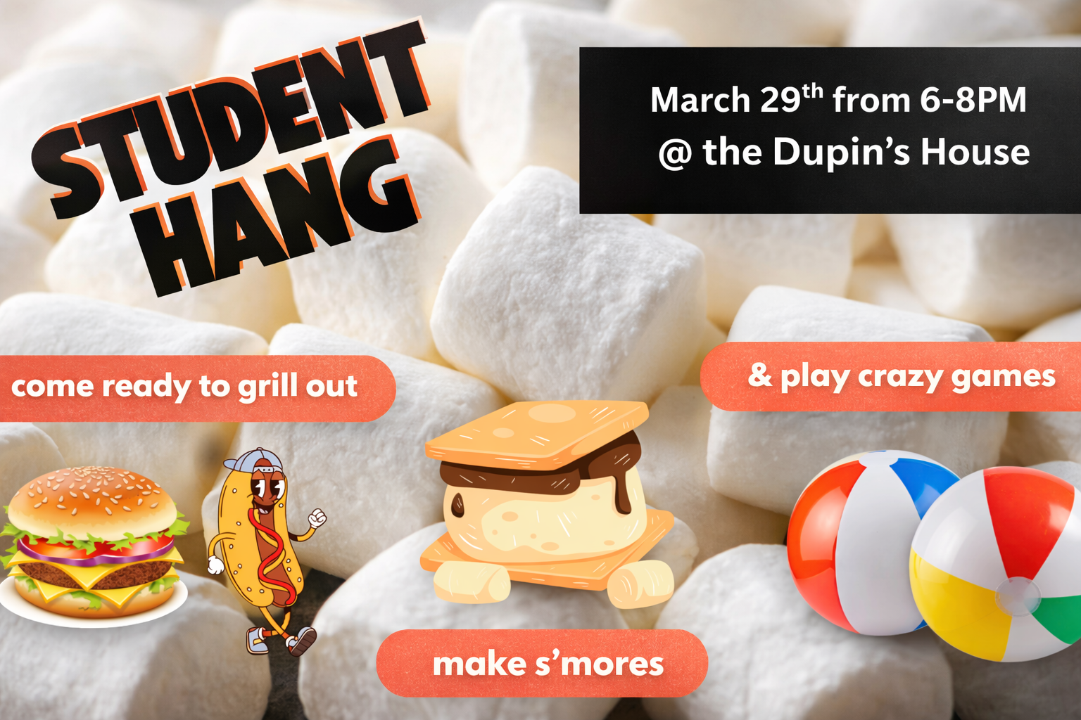 We are so excited about this Sunday’s Student Hang! We will be grilling out, making s’mores, playing games, and having a blast connecting all together.